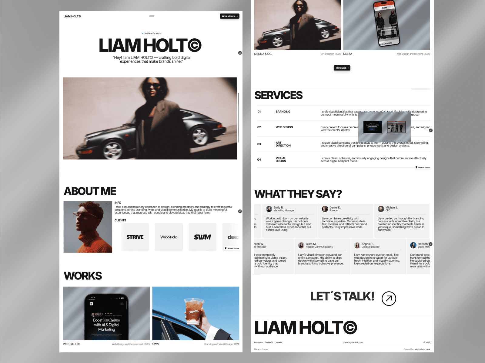 LIAM HOLT© is a premium portfolio template designed and developed for distribution on the Framer Marketplace. The project was created to offer creatives a refined, modern framework for presenting their work with clarity, confidence, and visual impact.